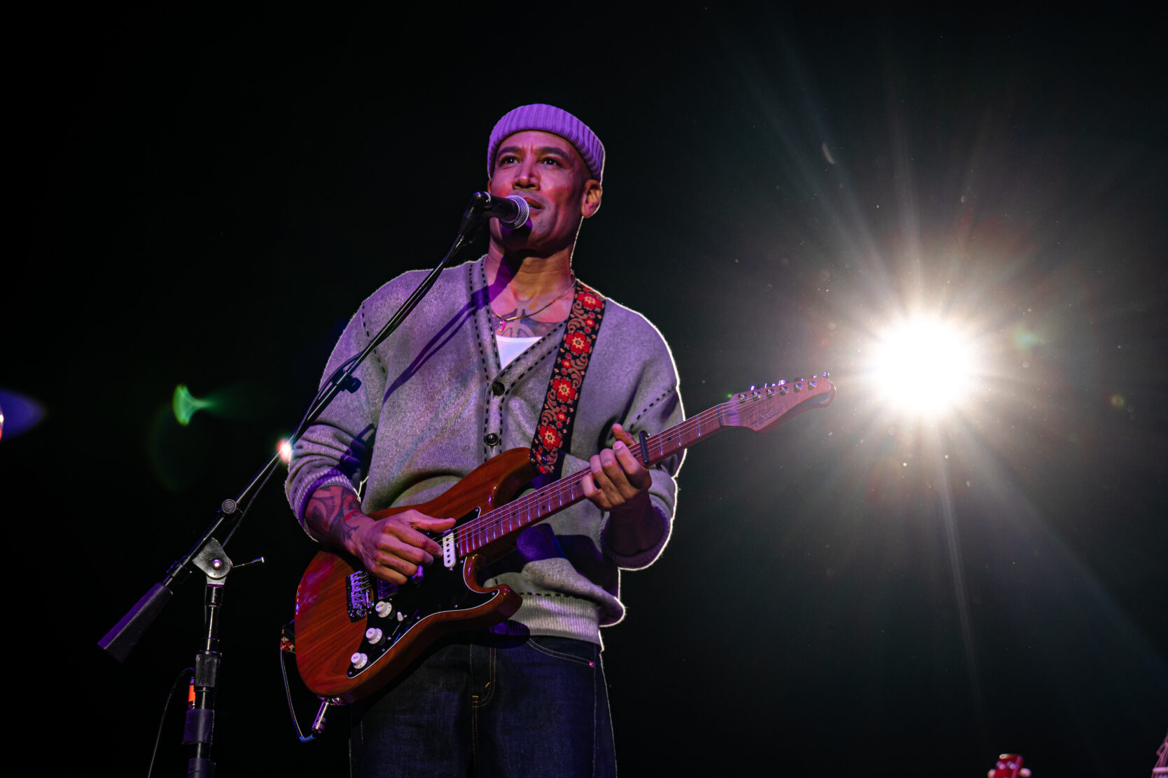 At the Nov. 12 show, Harper stepped onto the Forum stage alone. Wearing a pink beanie and a white sweater streaked with color, he performed an eight-song set, much of it solo. He was then joined by a four-person choir for the a cappella “Below Sea Level,” which opens his new album, Bloodline Maintenance (which is currently nominated for a Grammy for Best Contemporary Blues Album).