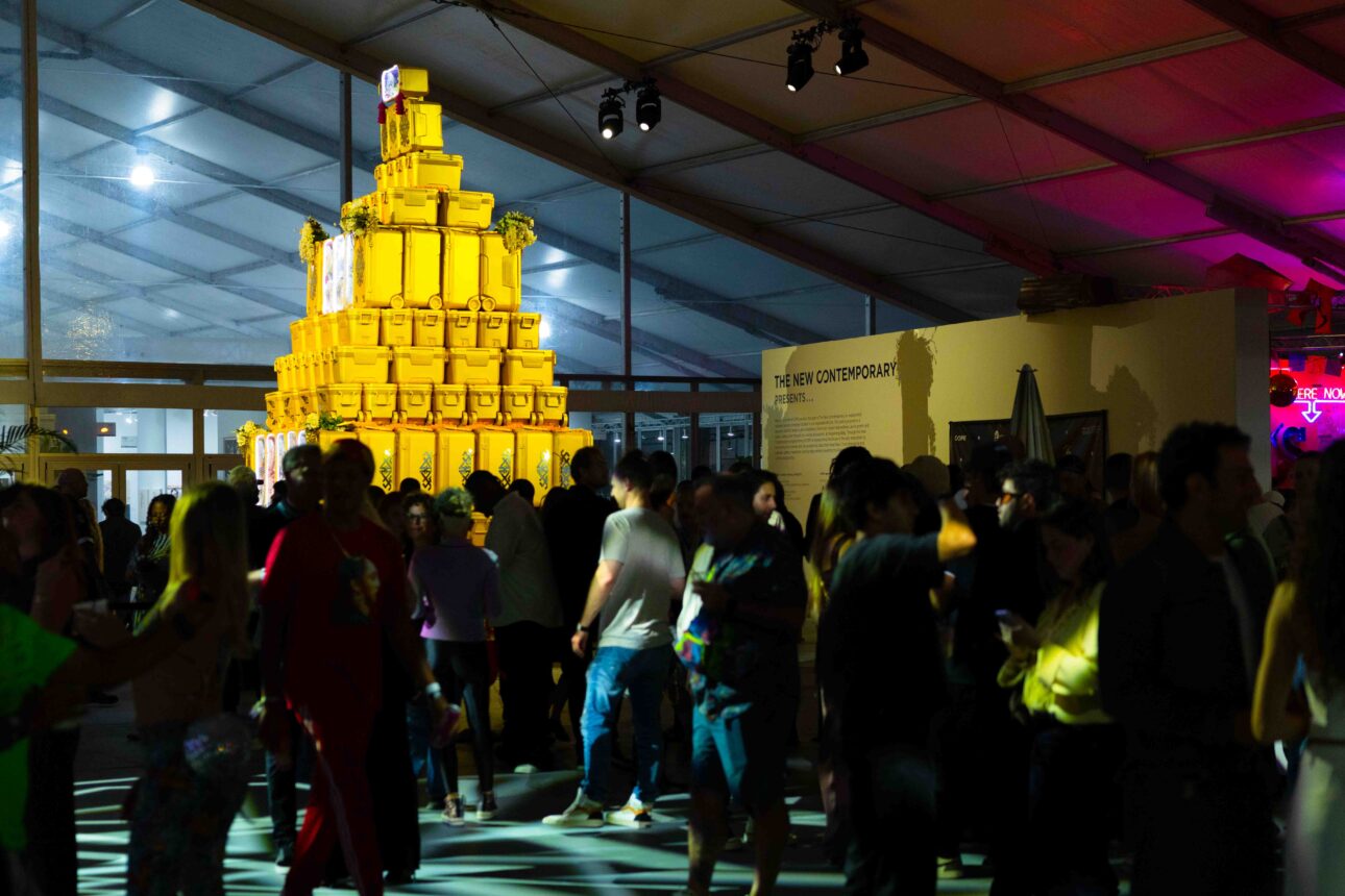 The party began with chic sophistication from James’ sunset selection of funkadelic, disco-tized wax. Attendees walked the sandy runway to the SCOPE art fair gates, where just beyond awaited a surfside garden of earthly delights. The tent space was transformed with large art installations, vendors and activations. At the entrance, a golden Mayan pyramid made from rolling coolers represented immigrants across America who earn a living as street vendors, while around the corner was a full-on dive bar, complete with a pool table, foosball, a vintage arcade video game machine and a Touch Tunes jukebox.